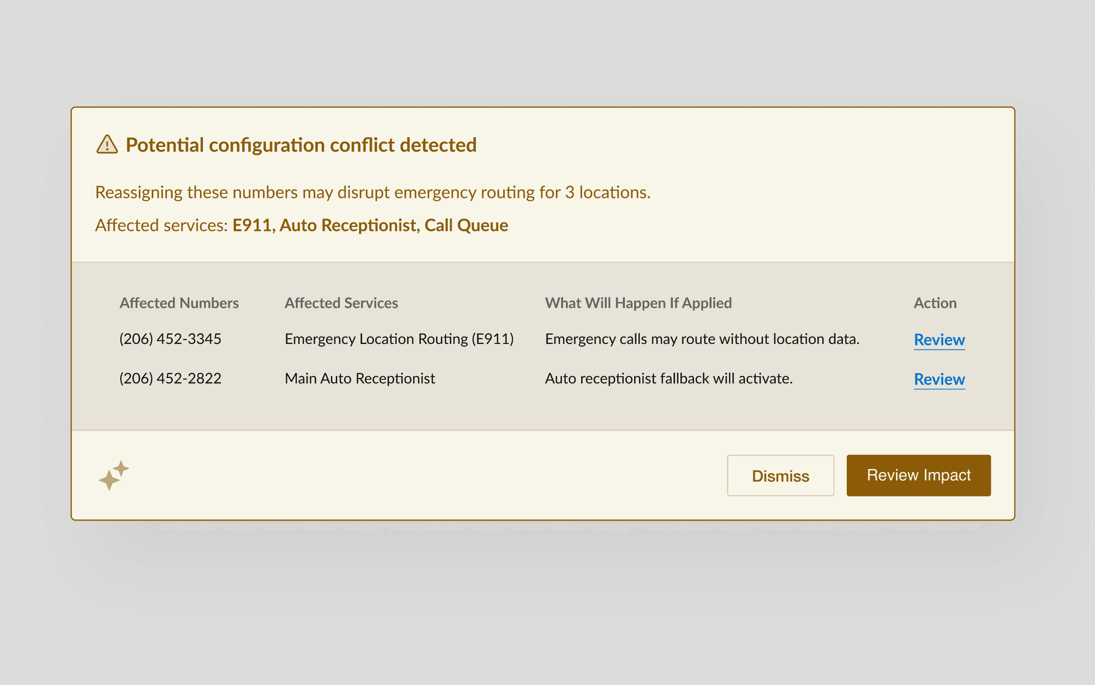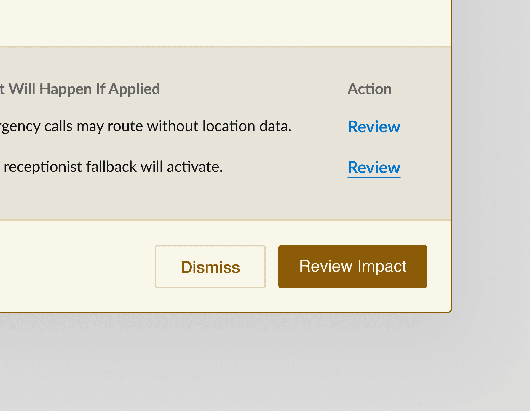 Instead of blocking actions, the interface explains consequences, highlights affected services, and links admins to review locations, allowing informed decisions while maintaining full control.