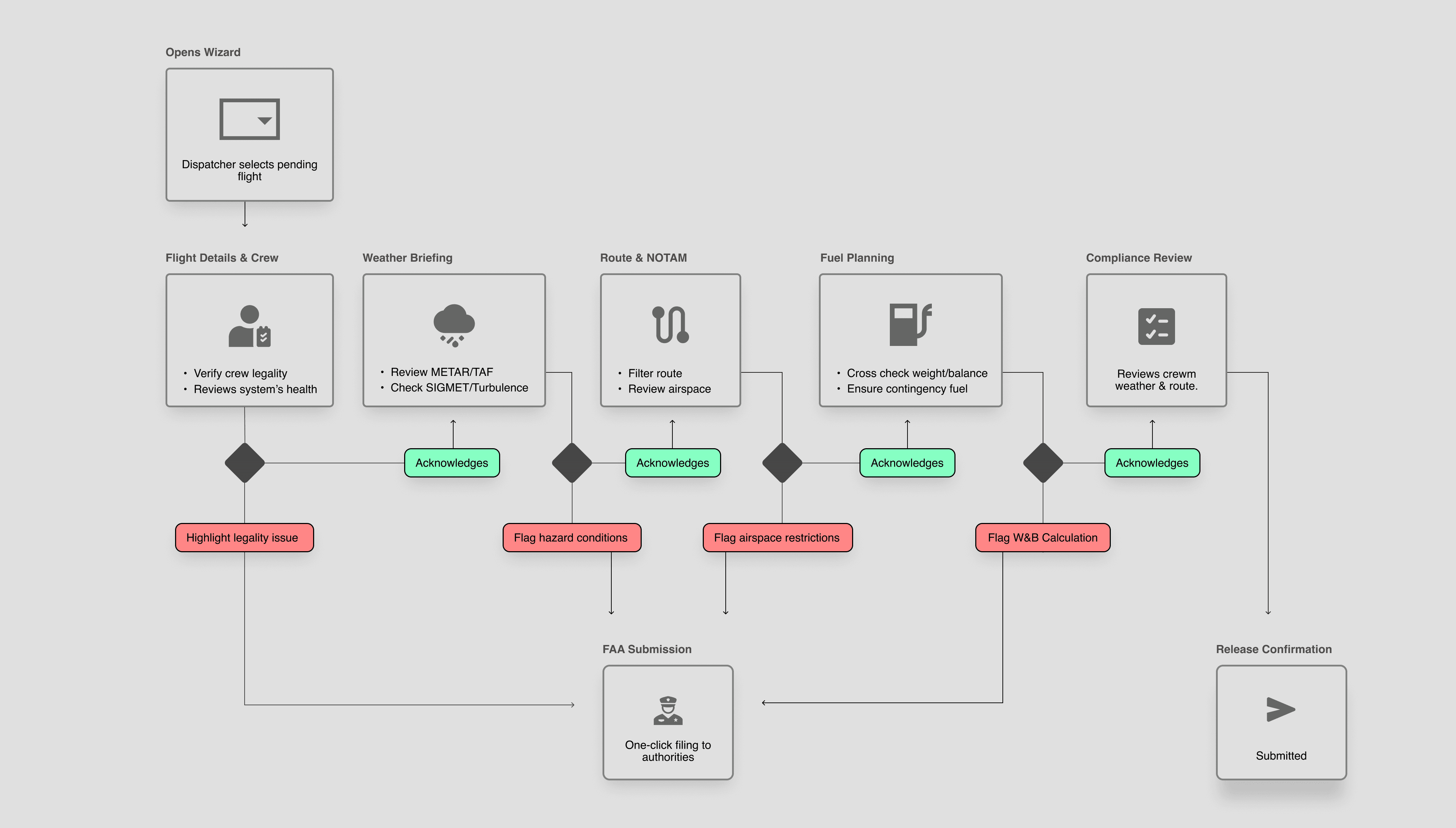 My approach was systems-driven and compliance-aware: unifying fragmented tools into a structured flight release wizard that mirrors dispatcher workflows while preserving full dispatcher authority over the final release decision.