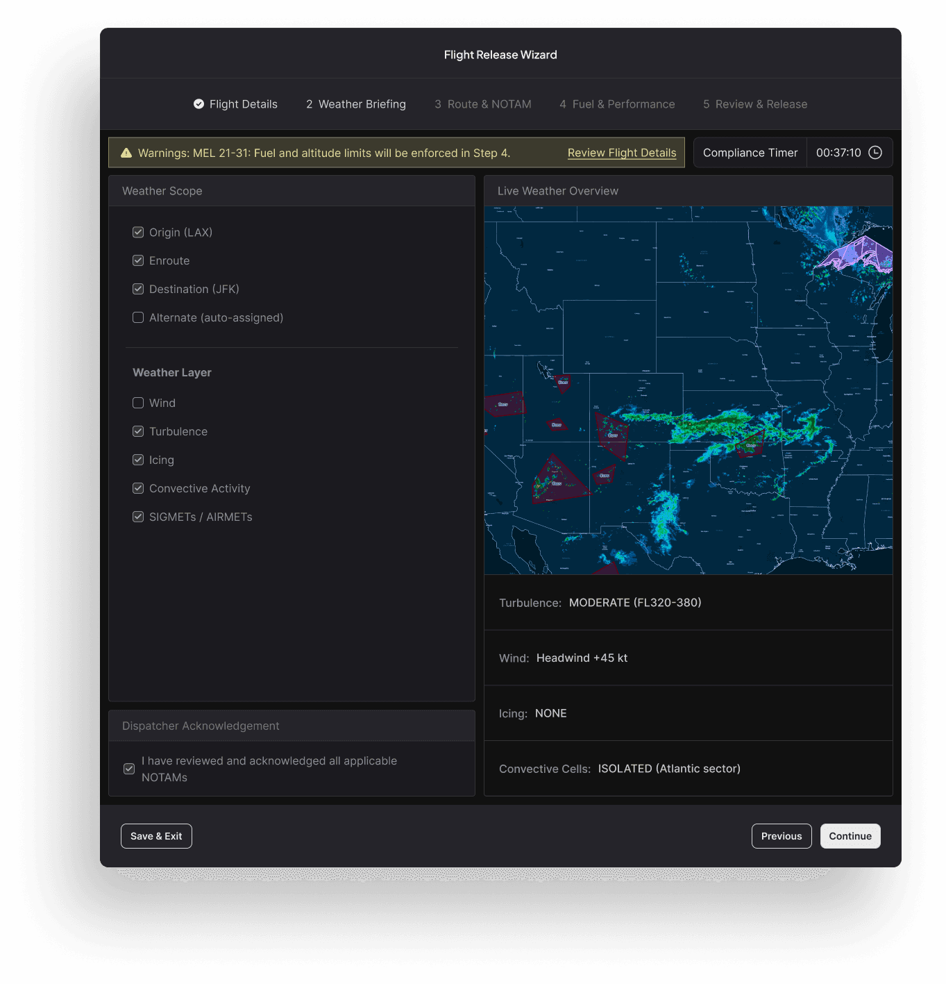 In this flow, dispatchers move through each step: flight details, weather, route and NOTAMs, fuel planning, and final compliance review - acknowledging system checks as they go.
