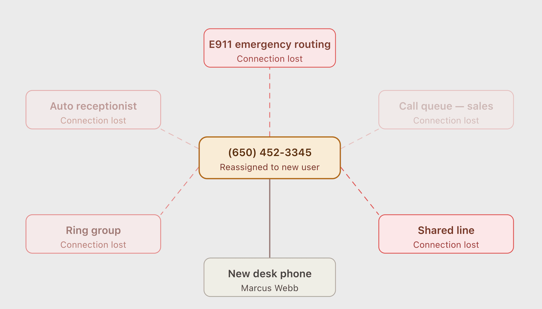 Persistent visibility into dependency state for every phone number. Not just at the moment of reassignment — always. Admins could see what each number was connected to before they made any change.