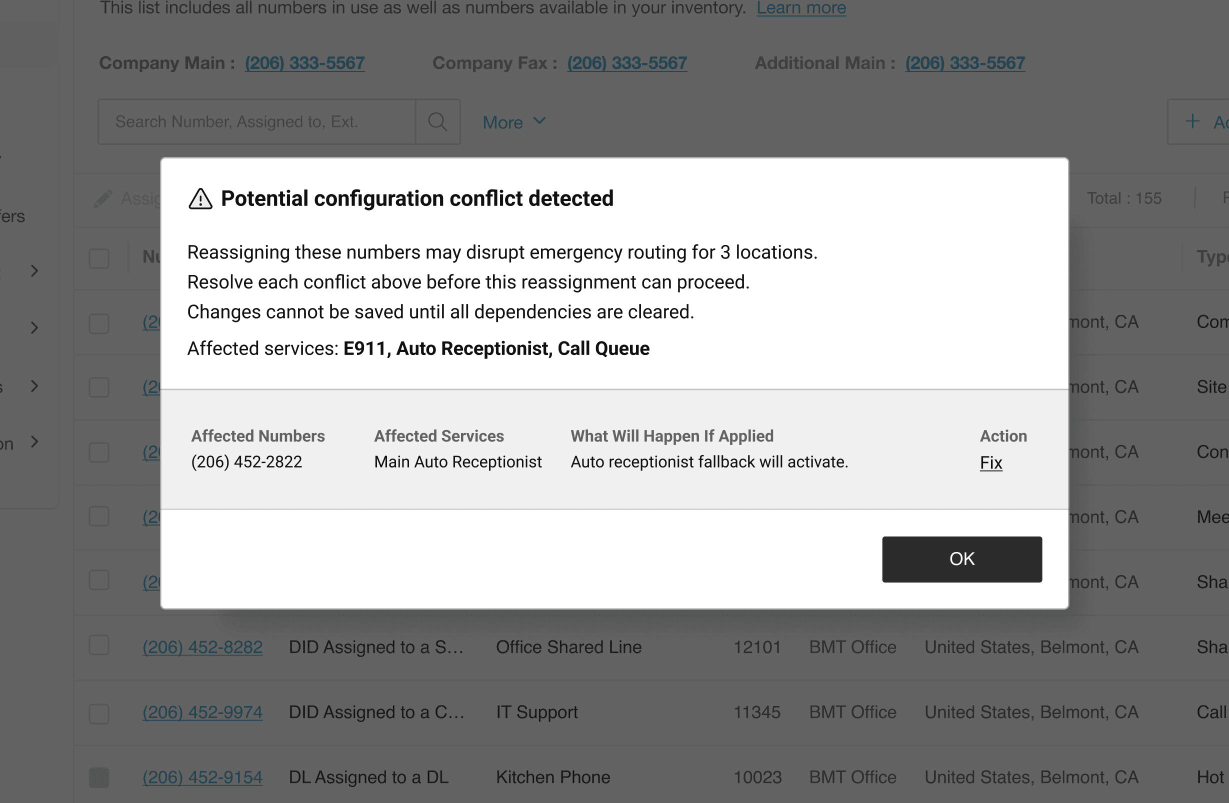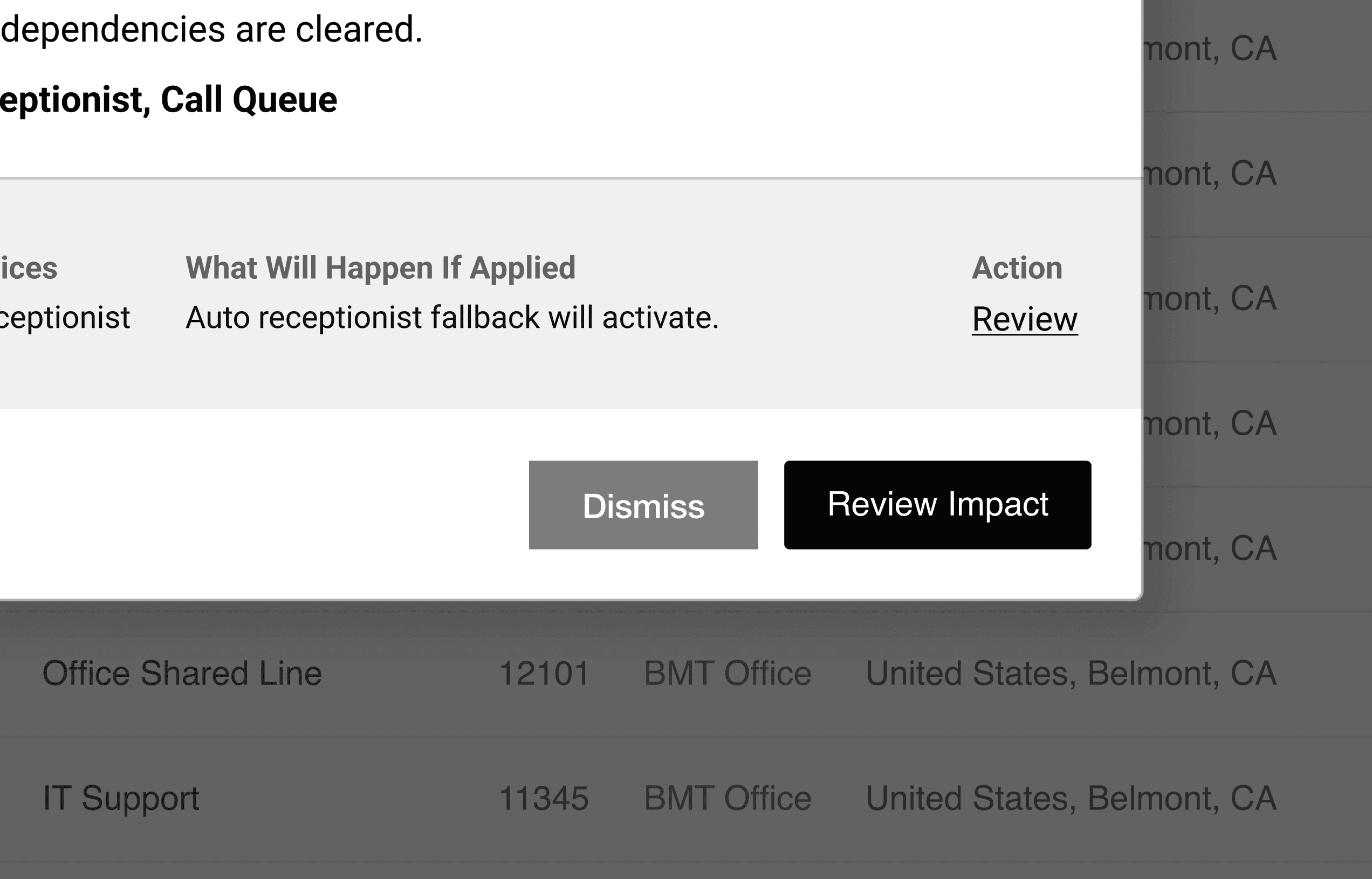 When the admin clicks Review Impact, the banner expands to a structured table: which numbers are affected, which services they're tied to, and a plain-language description of what will happen if the change is applied.