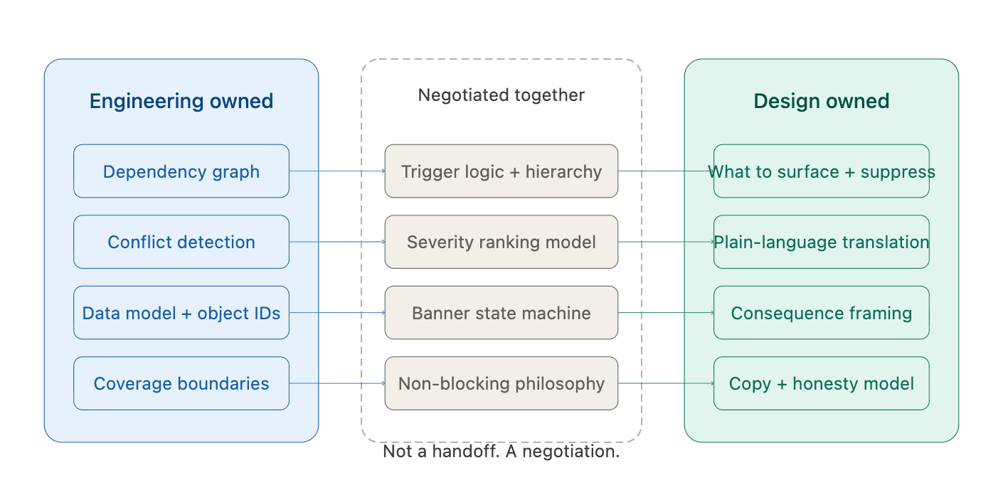 Engineering came in with a capability, not a requirement. The dependency graph existed. The system could run a pre-commit conflict check.